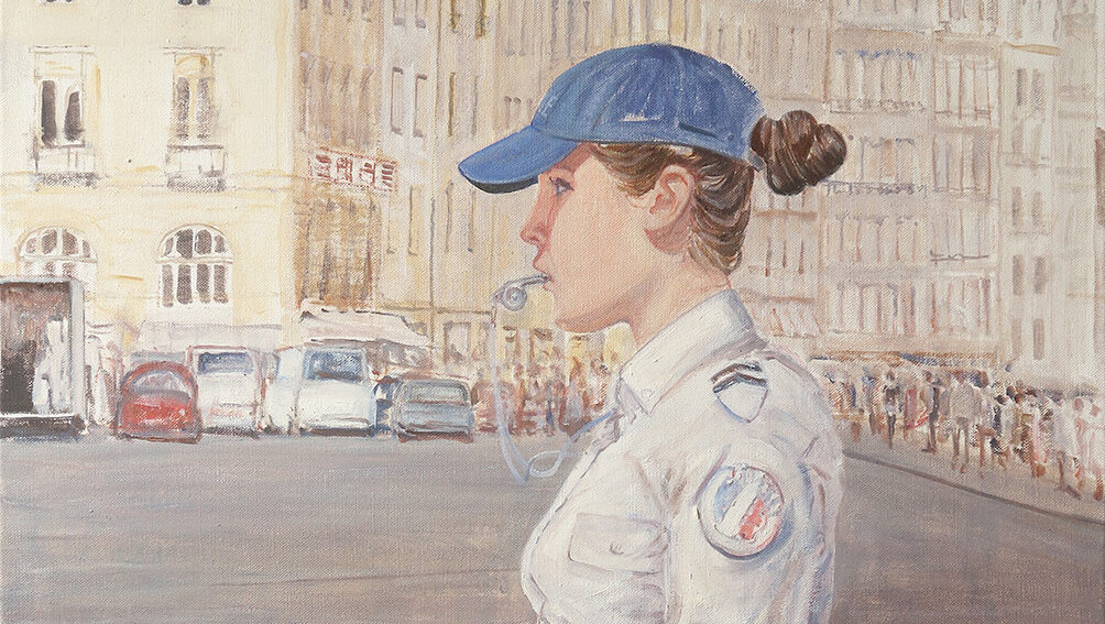Das führt oft zu einer unverrückbaren Trennung zwischen Freizeit und Arbeitszeit, als ob das eine die Freiheit und das andere die Verpflichtung repräsentiert. Diese Betrachtungsweise mag zwar fundamentale Werte wie Disziplin und Durchhaltevermögen widerspiegeln, lässt aber wenig Raum für die menschliche Komplexität und die Freude am Leben. Die Pflichterfüllung wird auf ironische Weise in dem Bild „Kartentrio im Dezernat Diebstahl und Einbruch“ von Bartolmäs gezeigt. Die netten Kollegen sind ins Kartenspiel vertieft. Eine Mitarbeiterin schaut angeregt dabei zu und hat schon die Hände auf ihren Favoriten gelegt. Der Bürger kann sich selbst um den Schutz seines Eigentums kümmern. Das Plakat an der Wand erinnert ihn daran.