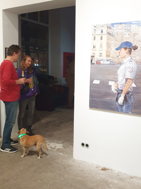Ganz anders stellt sich die Situation in Bunt’s Arbeit „Ich hab Polizei“ dar: Die Polizei als staatliche Machtinstitution in einem bürgerkriegsähnlichem Setting. Der Beamte im Vordergrund erscheint bedrohlich, die Waffe einsatzbereit, im Hintergrund ein Hubschrauber kreisend, alles vor einem dystopischem Hintergrund. Die reduzierte Farbpalette unterstreicht die gespenstische Atmosphäre.