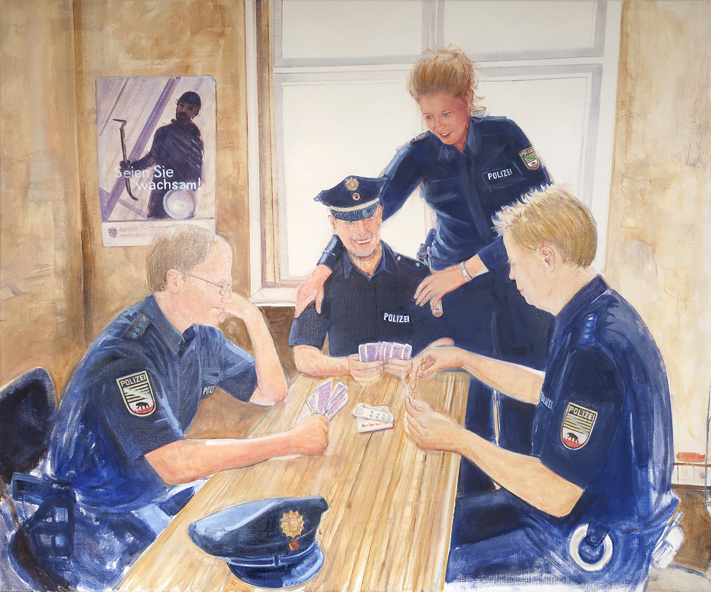 Genuß ohne Reue Politesse im Einsatz, 2025, Öl auf Leinwand, 120 x 85 cmKartentrio im Dezernat für Betrug und Diebstahl, 2025, Öl auf Leinwand, 100 x 120 cmNicht ohne Dienstanweisung, 2025, Öl auf Leinwand, 105 x 70 cmDie laufenden Ermittlungen, 2025, Öl auf Holz, 60 x 100 cmoder flirten auf der Betriebsfeier, 2024, Öl auf Holz, 71 x 125 cmDie Lebensfreude, 2023, Öl auf Leinwand, 120 x 80 cmDie Weinprobe, 2023, Öl auf Pappe, 56 x 42 cmDie Raucherin, 2021, Öl auf Leinwand, 47 x 31 cmDisco fever, 2020, Öl auf Leinwand, 85 x 125 cmschon auf Instagram, 2020, Öl auf Leinwand, 100 x 70 cmVernissage, ein Ort der Kultur, 2020, Öl auf Leinwand, 73 x 60cmDas Motiv, 2018, Öl auf Leinwand, 125 x 83 cmNachtschwärmer – das Malheur, 2018, Öl auf Leinwand, 75 x 125 cmTreppenhausparty mit Hund, 2017, Öl auf Leinwand, 120 x 80 cm Das Model, 2017, Öl auf Leinwand, 65 x 90 cmNiko & Tine – Lästern in der Raucherpause, 2017, Öl auf Leinwand, 120 x 85 cmSheriffs Walking, 2016, Öl auf Leinwand, 65 x 111 cmGenuß ohne Reue , 2016, Öl auf Leinwand, 105 x 140 cmProst – so ein Durst, 2016, Öl auf Leinwand, 135 x 99 cmSneaker gehen Gassi, 2016, Ölskizze (Pappe), 42 x 56 cmFleischeslust in Xian, 2015, Öl auf Leinwand, 99 x 110 cmChez Mai – non plus, 2015, Öl auf Leinwand, 105 x 115cmCapriccio Chinese, 2014, Öl auf Leinwand, 115 x 160 cmZeit der Illusionen (Auf der Treppe), 2014, Öl auf Leinwand, 150 x 105 cm